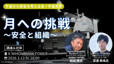 「宇宙から安全を考える会」と「宇宙大学」による初のコラボ講演&対談を開催。いよいよ人類が再び月を目指す時代がやってきました。未知の世界である「月面」という過酷な環境に、私たちはどう挑むのか?月面有人ローバー開発を牽引するJAXA・和田勝氏と、月面での燃料自給(推薬プラント)に挑む日揮グローバル・深浦希峰氏が語ります。