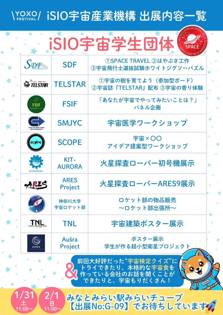 iSIOのブースでは、iSIO宇宙産業機構に所属する宇宙学生団体12団体のうち10団体が出展します。▶iSIO宇宙学生団体とは