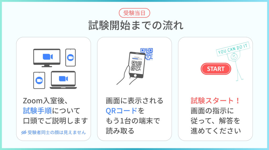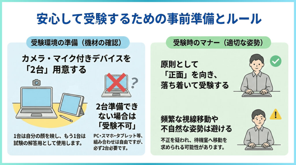 他者が映り込む・騒音のある場所は禁止。静かな個室(受験者以外立ち入りなし)を強く推奨します。
