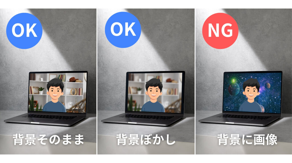 試験中のZoomの背景設定について、画像背景のご使用はご遠慮ください背景のぼかし機能のご使用は問題ございません。