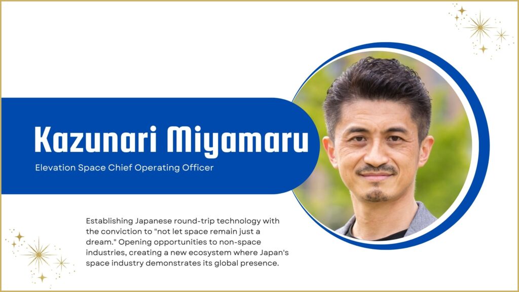 株式会社ElevationSpaceのCOOとして、同社の事業開発、渉外、セールス・マーケティング活動を統括し、無人宇宙環境利用・回収プラットフォーム「ELS-R」及び地球低軌道拠点から高頻度物資回収システム「ELS-RS」の実現を推進している。